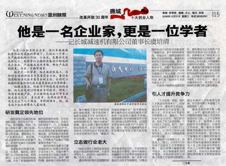 2008年12月31日《溫州晚報》第15版(鹿城十大創(chuàng)業(yè)人物專版)題為“他是一名企業(yè)家,更是一位學(xué)者”對虞培清董事長事跡進行了報道。