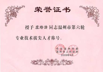 “溫州市第六輪專(zhuān)業(yè)界技術(shù)拔尖人才”榮譽(yù)證書(shū)