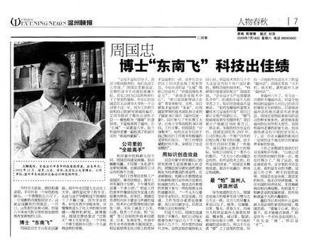 “父母不是知識分子,我讀書期間挺乖的,他們也沒怎么管我?!敝車倚χf道。安靜的讀書生活看似波瀾不驚,其實已經(jīng)為以后的科研打下了堅實的基礎(chǔ)。畢業(yè)后的周國忠在北京清華大學(xué)的一個公司里干過一年,因為工作的內(nèi)容和自己的研究領(lǐng)域有偏差,又因為結(jié)識了現(xiàn)在公司的老總——被他稱為“儒商”的虞培清,于是他來到了溫州,在“長城”一呆就是六年,如今和溫州老婆一起組成了名副其實的“新溫州家庭”。