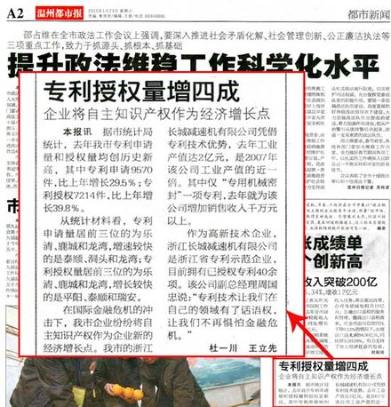 在國(guó)際金融危機(jī)的沖擊下,我市企業(yè)紛紛將自主知識(shí)產(chǎn)權(quán)作為企業(yè)新的經(jīng)濟(jì)增長(zhǎng)點(diǎn)。我市的浙江長(zhǎng)城減速機(jī)有限公司憑借專利技術(shù)優(yōu)勢(shì),去年工業(yè)產(chǎn)值達(dá)2億元,是2007年該公司工業(yè)產(chǎn)值的近一倍。其中僅“專用機(jī)械密封”一項(xiàng)專利,去年就為該公司增加銷售收入千萬(wàn)元以上。