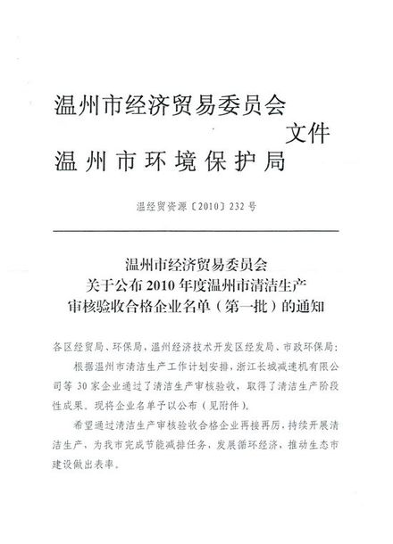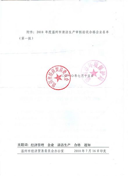 2010年度溫州市清潔生產(chǎn)審核驗(yàn)收合格企業(yè)名單(第一批)已于2010年7月15日公布,我公司已通過(guò)