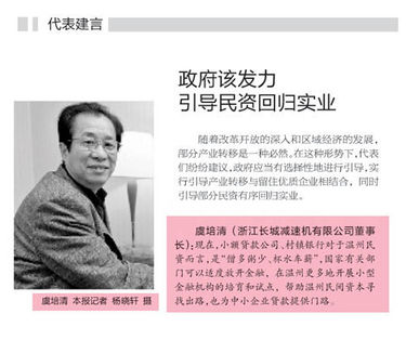 虞總建言:現(xiàn)在,小額貸款公司、村鎮(zhèn)銀行對于溫州民資而言,是“僧多粥少、杯水車薪”,國家有關部門可以適度放開金融,在溫州更多地開展小型金融機構的培育和試點,幫助溫州民間資本尋找出路,也為中小企業(yè)貸款提供門路。