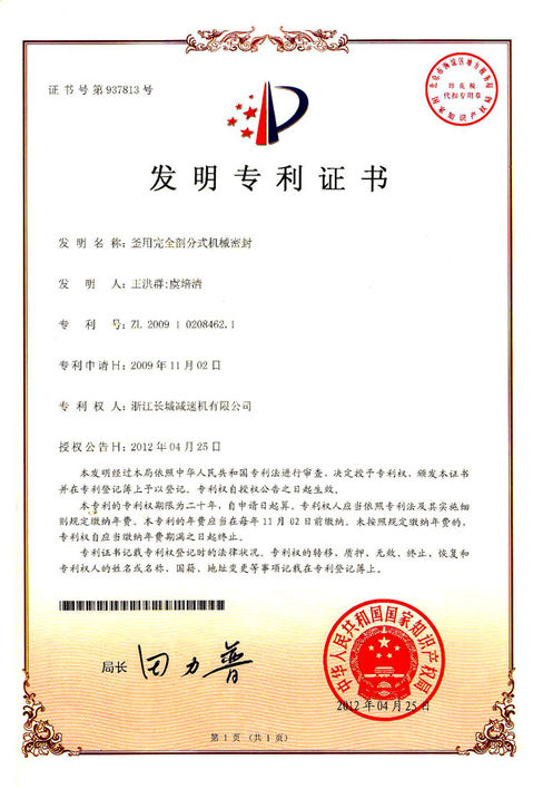 “釜用完全剖分式機械密封”發(fā)明專利證書