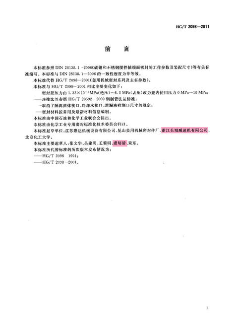 中華人民共和國化工行業(yè)標準《釜用機械密封類型、主要尺寸及標志》HG/T2098-2011代替HG/T2098-2001已于2012年7月1日開始實。我公司為此標準的起草單位之一,我公司董事長虞培清為此標準的主要起草人之一。