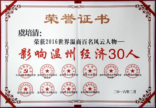 2月24日上午,2016屆“世界溫商”對話會暨世界溫商百名風云人物頒獎典禮在市人民大會堂隆重舉。公司董事長虞培清榮獲“世界溫商百名風云人物—影響溫州經濟30人”,市四套班子領導為獲獎者頒獎。此次活動由中共溫州市委宣傳部、市經信委、市科技局、市商務局(市網絡局)、市外僑辦、市僑聯(lián)、市貿促會、市工商聯(lián)、溫州日報報業(yè)集團、溫州廣播傳媒聯(lián)合主辦。