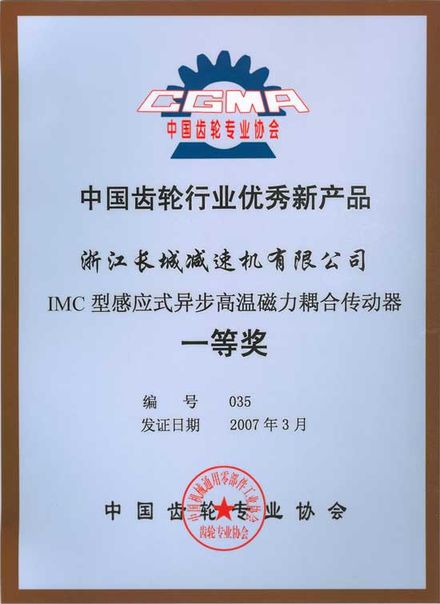 IMC型感應(yīng)式異步高溫磁力耦合傳動(dòng)器 一等獎(jiǎng)證書