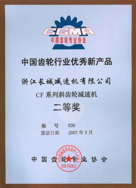 CF系列斜齒輪減速機(jī) 二等獎(jiǎng)證書